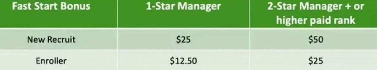 Each week that the new BP has a Paid Rank of 1-Star Manager or higher they earn the Fast Star Bonus: $25 or $50 (max earning opportunity of $450).