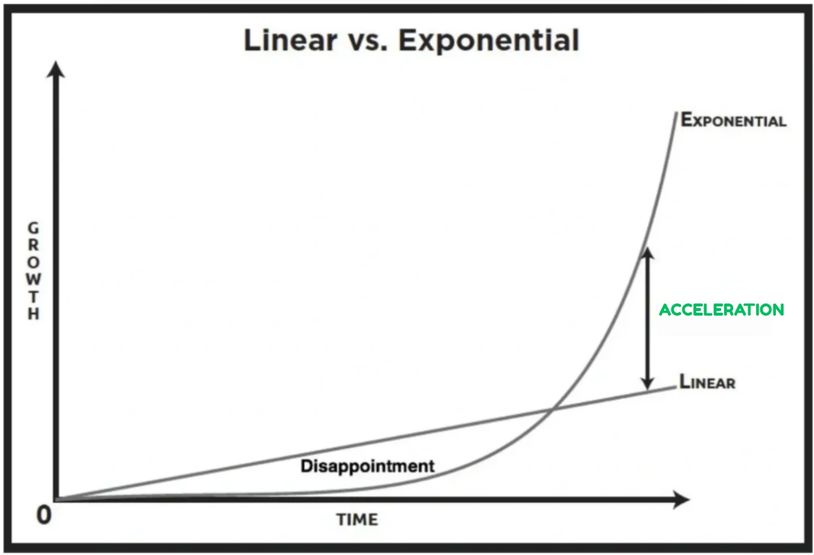 Linear growth is steady, while exponential growth starts small and accelerates.